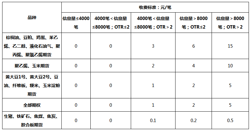 申報費按日收取,期貨合約申報費按合約統(tǒng)計,期權(quán)合約申報費按合約月份統(tǒng)計。各期貨、期權(quán)合約收費標(biāo)準(zhǔn)如下: